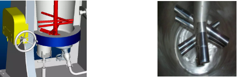 (1)攪拌器設(shè)計(jì):具有特殊設(shè)計(jì)的攪拌器:上面是帶硬質(zhì)合金套筒的攪拌臂,不銹鋼攪拌軸。最下面是一特殊設(shè)計(jì)的提升攪拌臂,可以將研磨缸底部的磨介和物料全部翻騰起來??朔似渌心C(jī)底部有死角、研磨不均勻的弊病。