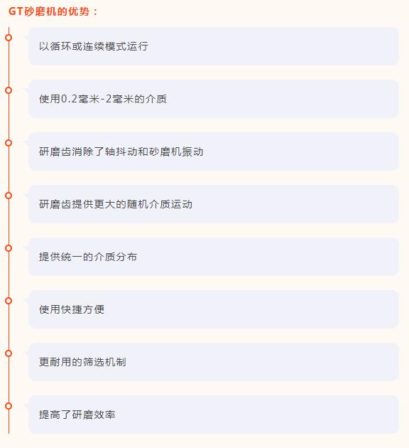 GT是小磨介攪拌磨家族的最新成員。它使用新型研磨齒。這種專利設(shè)計(jì)消除了軸抖動(dòng)和攪拌磨振動(dòng),同時(shí)提供更大的隨機(jī)介質(zhì)運(yùn)動(dòng),以提高研磨效率。該攪拌磨設(shè)計(jì)用于容納0.2mm至2.0mm的介質(zhì)。