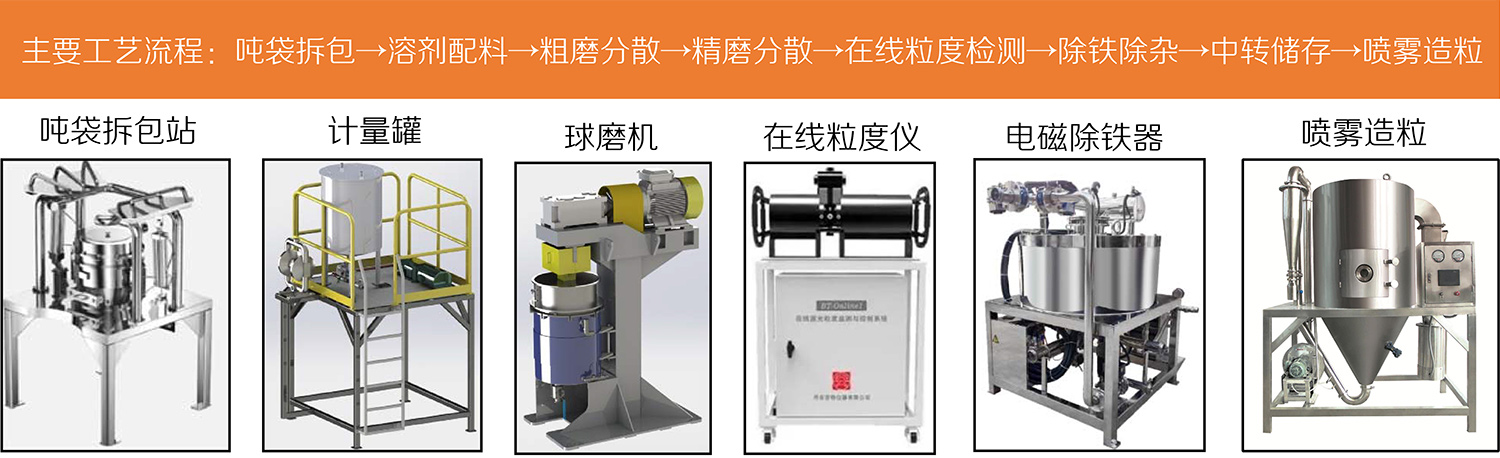 氧化鋁智能生產(chǎn)線滿足整個過程中全封閉、自動化、數(shù)字化、智能化生產(chǎn),實現(xiàn)配料精確、質(zhì)量穩(wěn)定、集中控制,連續(xù)生產(chǎn)的要求,所有參與物料循環(huán)的設(shè)備及零部件經(jīng)過ETFE涂層處理,可防止物料污染。產(chǎn)線主要設(shè)備及系統(tǒng)配置主要有噸袋拆包一體機(jī)、溶膠攪挫系統(tǒng)、粉料配料輸送系統(tǒng)、稱重緩存系統(tǒng),UP高端球磨機(jī)、在線粒度檢測、除鐵除磁系統(tǒng)、噴霧造粒系統(tǒng),除塵過濾系統(tǒng)、安全監(jiān)控系統(tǒng)等。根據(jù)客戶需求,可配置不同UP高端球磨機(jī),實現(xiàn)滿足于微米級至納米級物料生產(chǎn)。